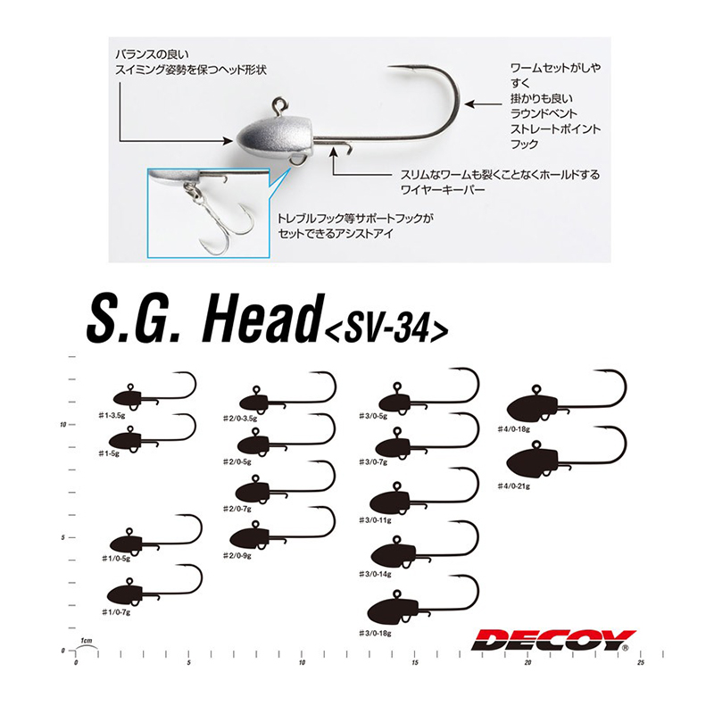 Η μολυβοκεφαλή SV-34 SG από την εταιρεία Decoy, έχει σχεδιαστεί για τεχνική ψαρέματος lrf και spinning. Είναι για λεπτές σιλικόνες και σκουλήκια με βάση δολώματος και πρόσθετη οπή για εύκολη προσάρτηση αγκίστρων.